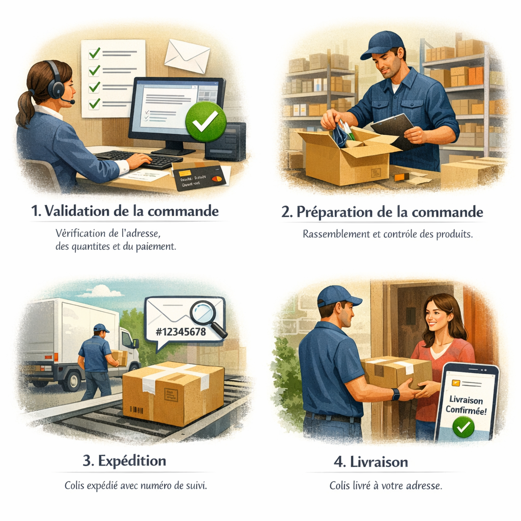 Commandes traitées en 24 à 48 heures ouvrées après paiement (inclut vérification, préparation et remise au transporteur).