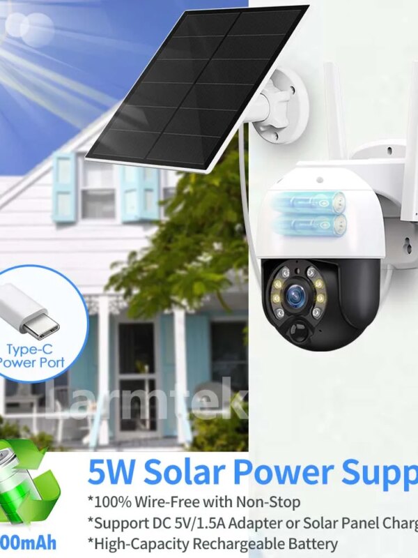 Connectez la caméra au panneau solaire et elle sera alimentée sans interruption toute la journée et toute la nuit. Vous placez facilement des panneaux solaires résistants aux intempéries pour maximiser l’exposition au soleil.