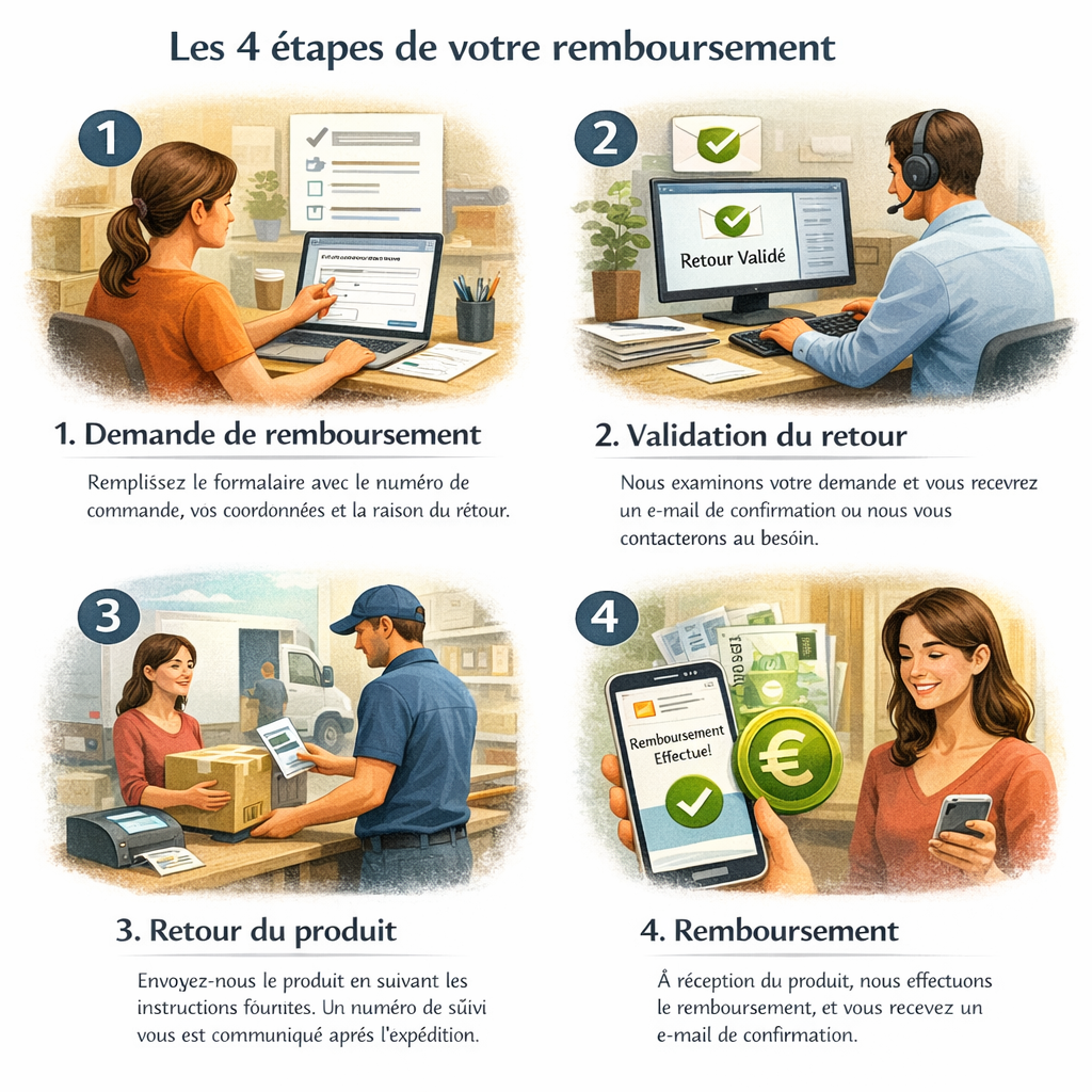 - Frais retour : remboursés si défaut/non-conformité/erreur notre part.